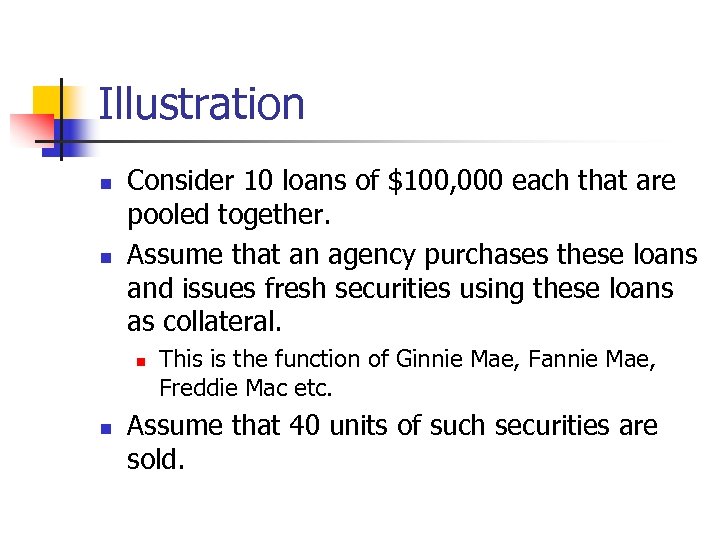 Illustration n n Consider 10 loans of $100, 000 each that are pooled together. Assume that an agency purchases these loans and issues fresh securities using these loans as collateral. n n This is the function of Ginnie Mae, Fannie Mae, Freddie Mac etc. Assume that 40 units of such securities are sold.