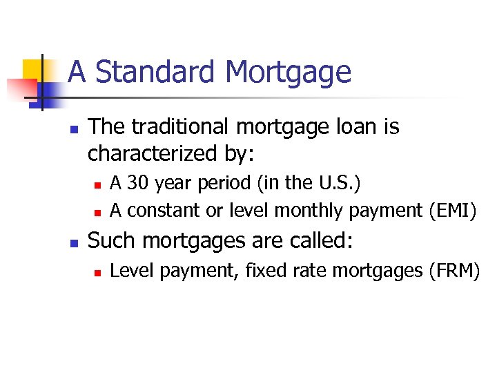 A Standard Mortgage n The traditional mortgage loan is characterized by: n n n A 30 year period (in the U. S. ) A constant or level monthly payment (EMI) Such mortgages are called: n Level payment, fixed rate mortgages (FRM)