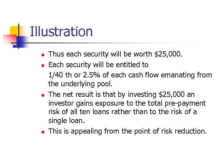 Illustration n n Thus each security will be worth $25, 000. Each security will be entitled to 1/40 th or 2. 5% of each cash flow emanating from the underlying pool. The net result is that by investing $25, 000 an investor gains exposure to the total pre-payment risk of all ten loans rather than to the risk of a single loan. This is appealing from the point of risk reduction.