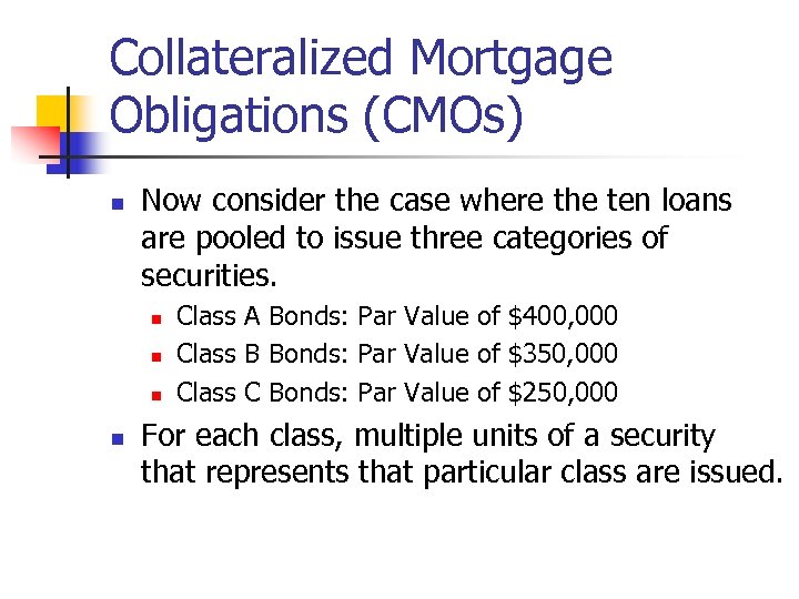 Collateralized Mortgage Obligations (CMOs) n Now consider the case where the ten loans are pooled to issue three categories of securities. n n Class A Bonds: Par Value of $400, 000 Class B Bonds: Par Value of $350, 000 Class C Bonds: Par Value of $250, 000 For each class, multiple units of a security that represents that particular class are issued.