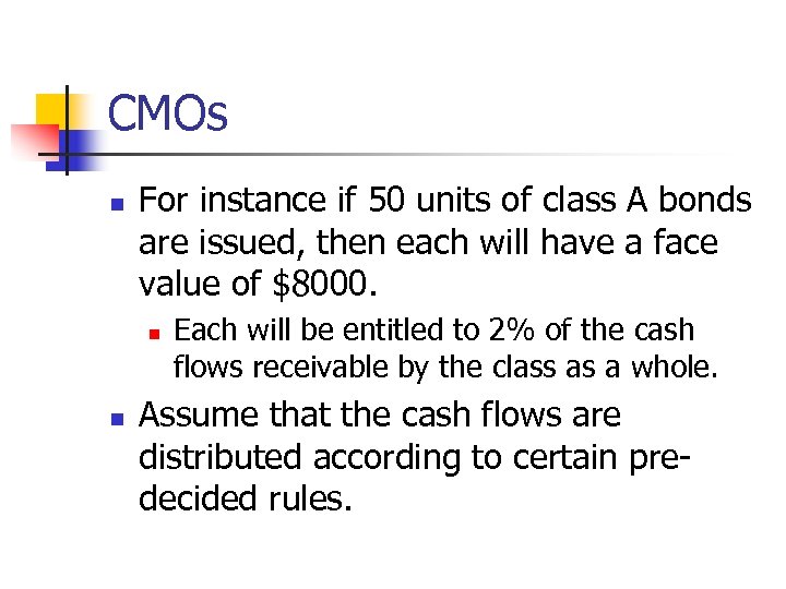 CMOs n For instance if 50 units of class A bonds are issued, then each will have a face value of $8000. n n Each will be entitled to 2% of the cash flows receivable by the class as a whole. Assume that the cash flows are distributed according to certain predecided rules.