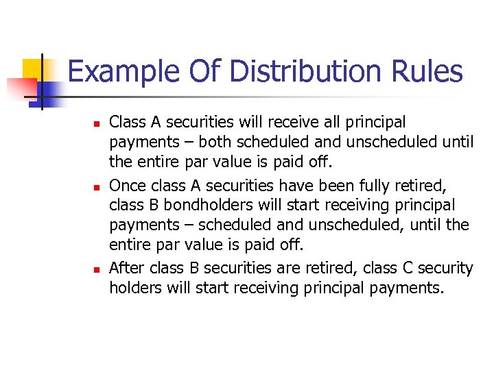 Example Of Distribution Rules n n n Class A securities will receive all principal payments – both scheduled and unscheduled until the entire par value is paid off. Once class A securities have been fully retired, class B bondholders will start receiving principal payments – scheduled and unscheduled, until the entire par value is paid off. After class B securities are retired, class C security holders will start receiving principal payments.