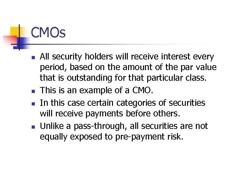CMOs n n All security holders will receive interest every period, based on the amount of the par value that is outstanding for that particular class. This is an example of a CMO. In this case certain categories of securities will receive payments before others. Unlike a pass-through, all securities are not equally exposed to pre-payment risk.