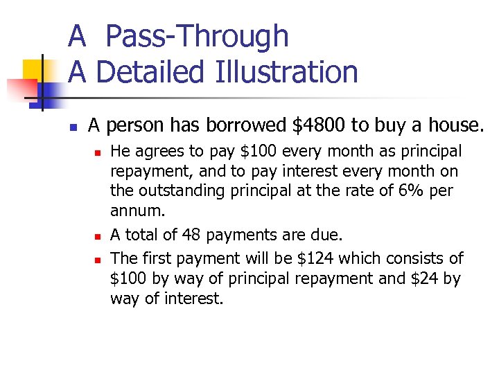 A Pass-Through A Detailed Illustration n A person has borrowed $4800 to buy a house. n n n He agrees to pay $100 every month as principal repayment, and to pay interest every month on the outstanding principal at the rate of 6% per annum. A total of 48 payments are due. The first payment will be $124 which consists of $100 by way of principal repayment and $24 by way of interest.
