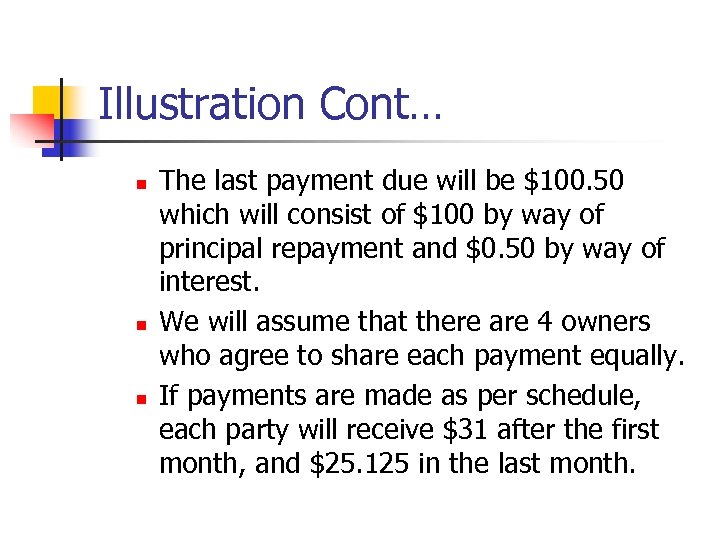 Illustration Cont… n n n The last payment due will be $100. 50 which will consist of $100 by way of principal repayment and $0. 50 by way of interest. We will assume that there are 4 owners who agree to share each payment equally. If payments are made as per schedule, each party will receive $31 after the first month, and $25. 125 in the last month.