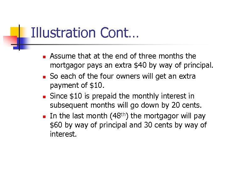 Illustration Cont… n n Assume that at the end of three months the mortgagor pays an extra $40 by way of principal. So each of the four owners will get an extra payment of $10. Since $10 is prepaid the monthly interest in subsequent months will go down by 20 cents. In the last month (48 th) the mortgagor will pay $60 by way of principal and 30 cents by way of interest.