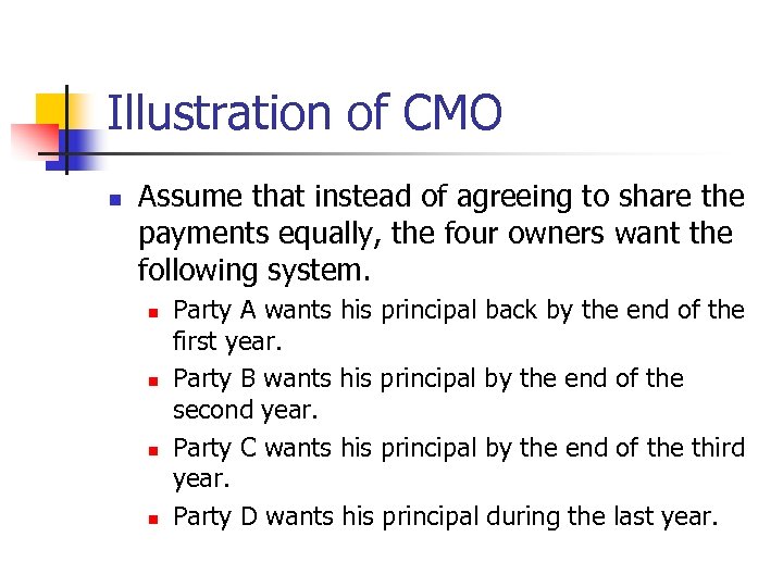 Illustration of CMO n Assume that instead of agreeing to share the payments equally, the four owners want the following system. n n Party A wants his principal back by the end of the first year. Party B wants his principal by the end of the second year. Party C wants his principal by the end of the third year. Party D wants his principal during the last year.