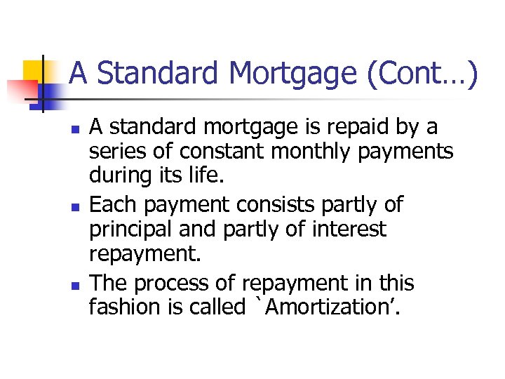A Standard Mortgage (Cont…) n n n A standard mortgage is repaid by a series of constant monthly payments during its life. Each payment consists partly of principal and partly of interest repayment. The process of repayment in this fashion is called `Amortization’.
