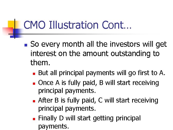 CMO Illustration Cont… n So every month all the investors will get interest on the amount outstanding to them. n n But all principal payments will go first to A. Once A is fully paid, B will start receiving principal payments. After B is fully paid, C will start receiving principal payments. Finally D will start getting principal payments.