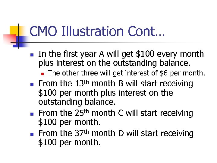 CMO Illustration Cont… n In the first year A will get $100 every month plus interest on the outstanding balance. n n The other three will get interest of $6 per month. From the 13 th month B will start receiving $100 per month plus interest on the outstanding balance. From the 25 th month C will start receiving $100 per month. From the 37 th month D will start receiving $100 per month.