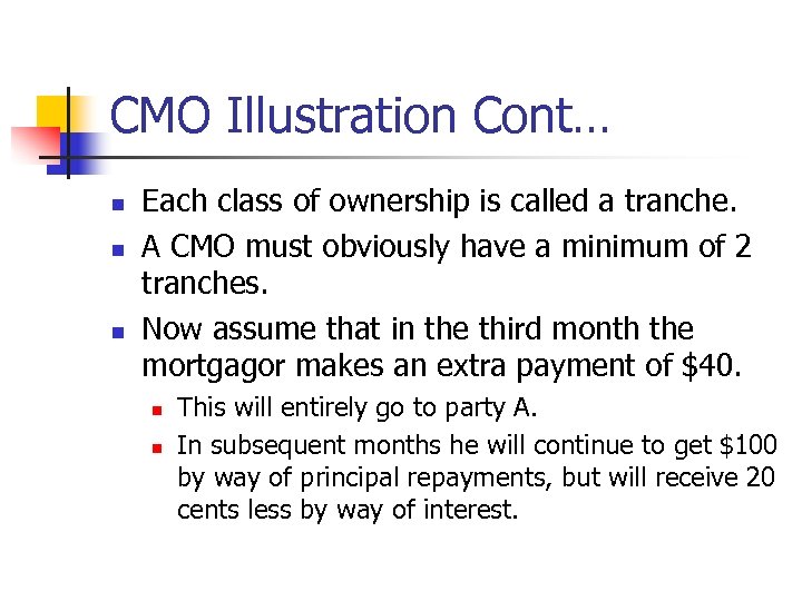 CMO Illustration Cont… n n n Each class of ownership is called a tranche. A CMO must obviously have a minimum of 2 tranches. Now assume that in the third month the mortgagor makes an extra payment of $40. n n This will entirely go to party A. In subsequent months he will continue to get $100 by way of principal repayments, but will receive 20 cents less by way of interest.