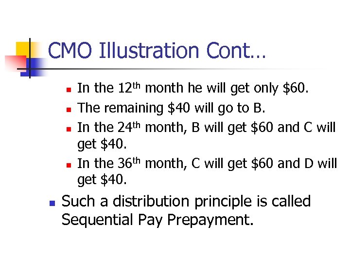 CMO Illustration Cont… n n n In the 12 th month he will get only $60. The remaining $40 will go to B. In the 24 th month, B will get $60 and C will get $40. In the 36 th month, C will get $60 and D will get $40. Such a distribution principle is called Sequential Pay Prepayment.