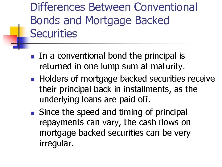 Differences Between Conventional Bonds and Mortgage Backed Securities n n n In a conventional bond the principal is returned in one lump sum at maturity. Holders of mortgage backed securities receive their principal back in installments, as the underlying loans are paid off. Since the speed and timing of principal repayments can vary, the cash flows on mortgage backed securities can be very irregular.