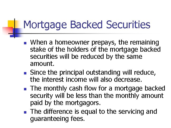 Mortgage Backed Securities n n When a homeowner prepays, the remaining stake of the holders of the mortgage backed securities will be reduced by the same amount. Since the principal outstanding will reduce, the interest income will also decrease. The monthly cash flow for a mortgage backed security will be less than the monthly amount paid by the mortgagors. The difference is equal to the servicing and guaranteeing fees.