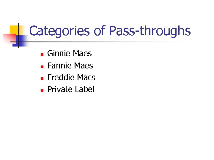 Categories of Pass-throughs n n Ginnie Maes Fannie Maes Freddie Macs Private Label