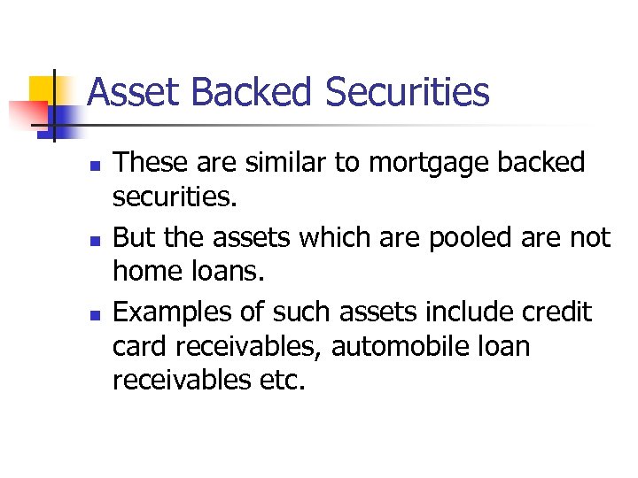 Asset Backed Securities n n n These are similar to mortgage backed securities. But the assets which are pooled are not home loans. Examples of such assets include credit card receivables, automobile loan receivables etc.