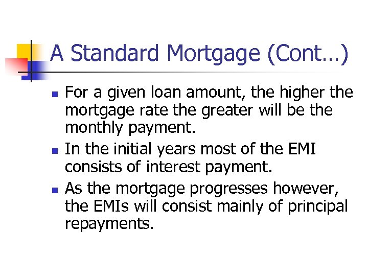 A Standard Mortgage (Cont…) n n n For a given loan amount, the higher the mortgage rate the greater will be the monthly payment. In the initial years most of the EMI consists of interest payment. As the mortgage progresses however, the EMIs will consist mainly of principal repayments.