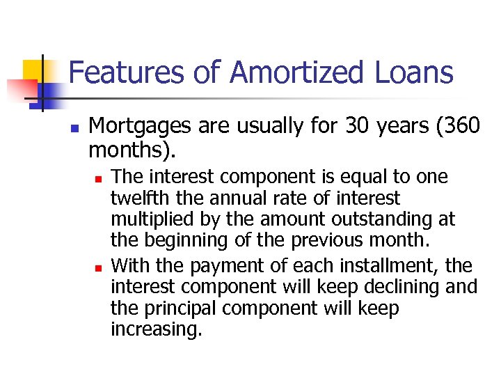 Features of Amortized Loans n Mortgages are usually for 30 years (360 months). n n The interest component is equal to one twelfth the annual rate of interest multiplied by the amount outstanding at the beginning of the previous month. With the payment of each installment, the interest component will keep declining and the principal component will keep increasing.