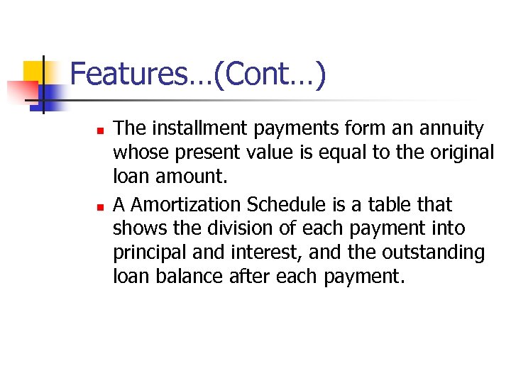 Features…(Cont…) n n The installment payments form an annuity whose present value is equal to the original loan amount. A Amortization Schedule is a table that shows the division of each payment into principal and interest, and the outstanding loan balance after each payment.