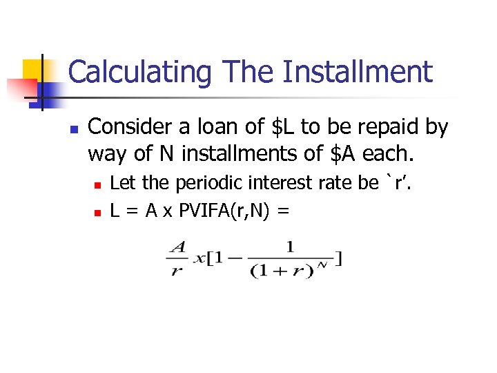Calculating The Installment n Consider a loan of $L to be repaid by way of N installments of $A each. n n Let the periodic interest rate be `r’. L = A x PVIFA(r, N) =