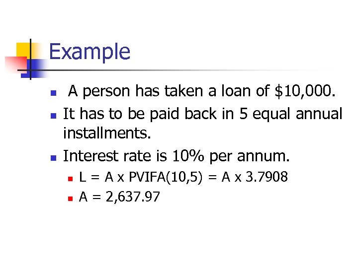 Example n n n A person has taken a loan of $10, 000. It has to be paid back in 5 equal annual installments. Interest rate is 10% per annum. n n L = A x PVIFA(10, 5) = A x 3. 7908 A = 2, 637. 97