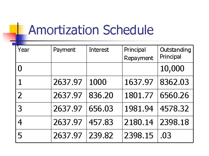 Amortization Schedule Year Payment Interest 0 Principal Repayment Outstanding Principal 10, 000 1 2637. 97 1000 1637. 97 8362. 03 2 2637. 97 836. 20 1801. 77 6560. 26 3 2637. 97 656. 03 1981. 94 4578. 32 4 2637. 97 457. 83 2180. 14 2398. 18 5 2637. 97 239. 82 2398. 15. 03