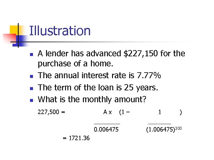 Illustration n n A lender has advanced $227, 150 for the purchase of a home. The annual interest rate is 7. 77% The term of the loan is 25 years. What is the monthly amount? 227, 500 = Ax (1 – ____ 0. 006475 = 1721. 36 1 ) _______ (1. 006475)300