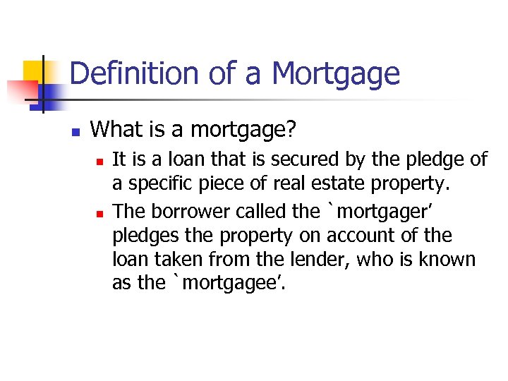 Definition of a Mortgage n What is a mortgage? n n It is a loan that is secured by the pledge of a specific piece of real estate property. The borrower called the `mortgager’ pledges the property on account of the loan taken from the lender, who is known as the `mortgagee’.