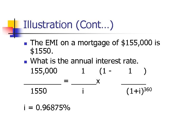 Illustration (Cont…) The EMI on a mortgage of $155, 000 is $1550. n What is the annual interest rate. 155, 000 1 (1 1 ) _____ = ______x ______ 1550 i (1+i)360 n i = 0. 96875%