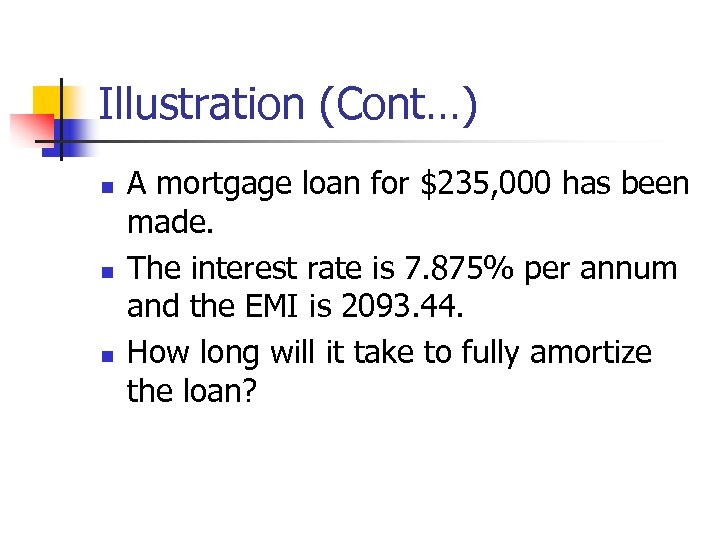 Illustration (Cont…) n n n A mortgage loan for $235, 000 has been made. The interest rate is 7. 875% per annum and the EMI is 2093. 44. How long will it take to fully amortize the loan?