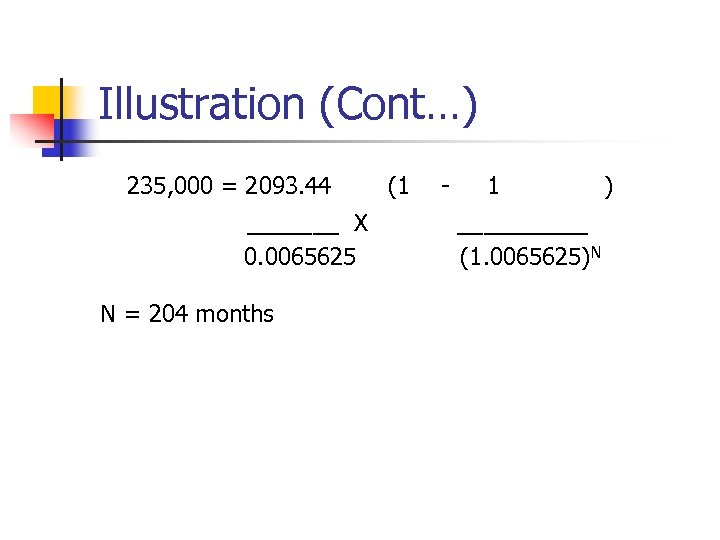 Illustration (Cont…) 235, 000 = 2093. 44 _______ X 0. 0065625 N = 204 months (1 - 1 _____ (1. 0065625)N )