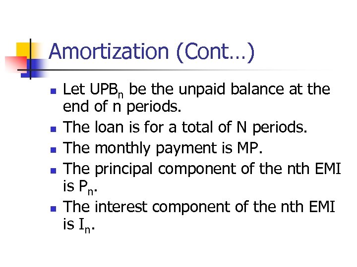 Amortization (Cont…) n n n Let UPBn be the unpaid balance at the end of n periods. The loan is for a total of N periods. The monthly payment is MP. The principal component of the nth EMI is Pn. The interest component of the nth EMI is In.
