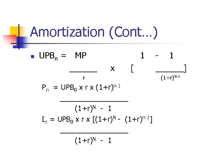 Amortization (Cont…) n UPBn = MP ______ 1 x [ r Pn = UPB 0 x r x (1+r)n-1 _________ (1+r)N - 1 In = UPB 0 x r x [(1+r)N - (1+r)n-1] _________ (1+r)N - 1 ______] (1+r)N-n