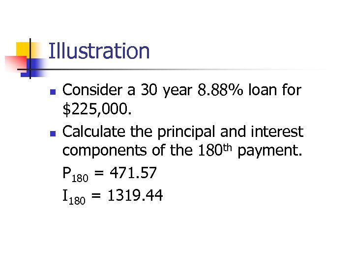 Illustration n n Consider a 30 year 8. 88% loan for $225, 000. Calculate the principal and interest components of the 180 th payment. P 180 = 471. 57 I 180 = 1319. 44