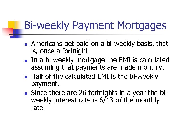 Bi-weekly Payment Mortgages n n Americans get paid on a bi-weekly basis, that is, once a fortnight. In a bi-weekly mortgage the EMI is calculated assuming that payments are made monthly. Half of the calculated EMI is the bi-weekly payment. Since there are 26 fortnights in a year the biweekly interest rate is 6/13 of the monthly rate.