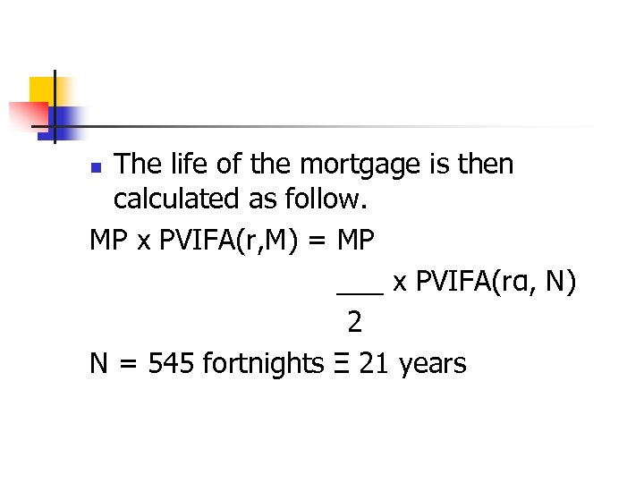 The life of the mortgage is then calculated as follow. MP x PVIFA(r, M) = MP ___ x PVIFA(rα, N) 2 N = 545 fortnights Ξ 21 years n