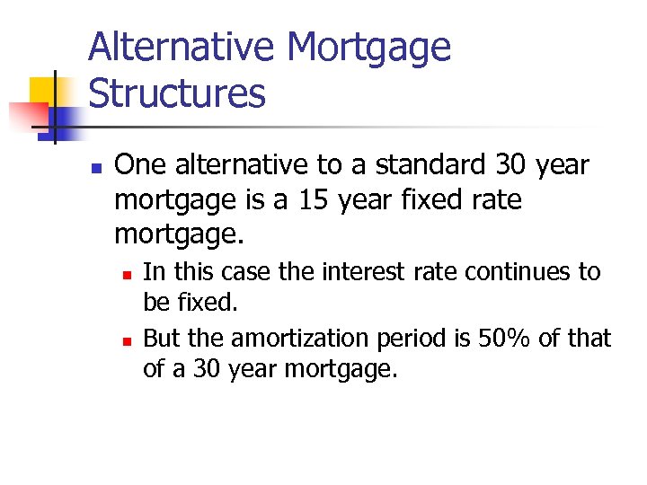 Alternative Mortgage Structures n One alternative to a standard 30 year mortgage is a 15 year fixed rate mortgage. n n In this case the interest rate continues to be fixed. But the amortization period is 50% of that of a 30 year mortgage.