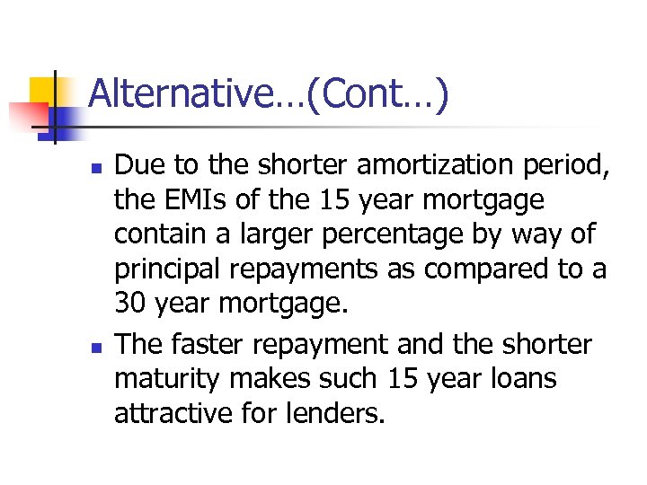 Alternative…(Cont…) n n Due to the shorter amortization period, the EMIs of the 15 year mortgage contain a larger percentage by way of principal repayments as compared to a 30 year mortgage. The faster repayment and the shorter maturity makes such 15 year loans attractive for lenders.