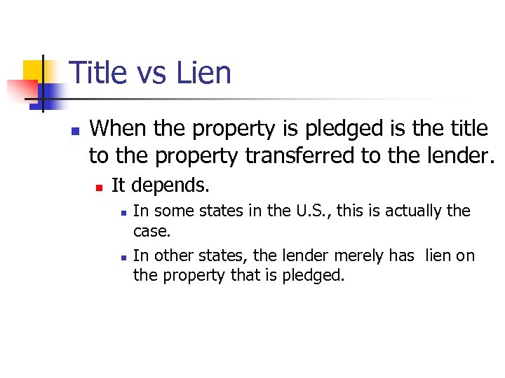 Title vs Lien n When the property is pledged is the title to the property transferred to the lender. n It depends. n n In some states in the U. S. , this is actually the case. In other states, the lender merely has lien on the property that is pledged.