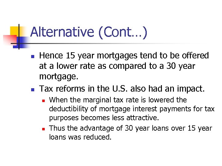 Alternative (Cont…) n n Hence 15 year mortgages tend to be offered at a lower rate as compared to a 30 year mortgage. Tax reforms in the U. S. also had an impact. n n When the marginal tax rate is lowered the deductibility of mortgage interest payments for tax purposes becomes less attractive. Thus the advantage of 30 year loans over 15 year loans was reduced.