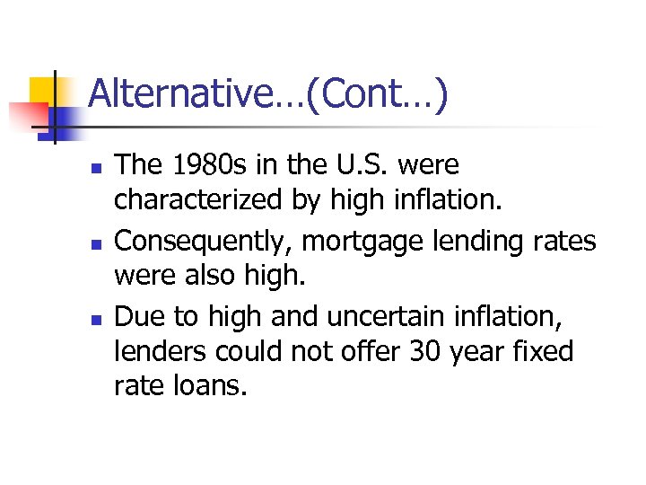 Alternative…(Cont…) n n n The 1980 s in the U. S. were characterized by high inflation. Consequently, mortgage lending rates were also high. Due to high and uncertain inflation, lenders could not offer 30 year fixed rate loans.