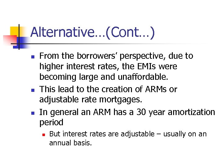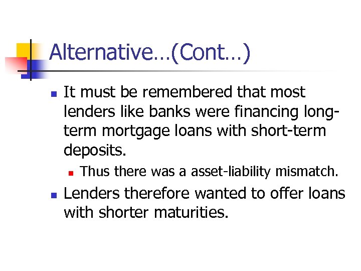 Alternative…(Cont…) n It must be remembered that most lenders like banks were financing longterm mortgage loans with short-term deposits. n n Thus there was a asset-liability mismatch. Lenders therefore wanted to offer loans with shorter maturities.