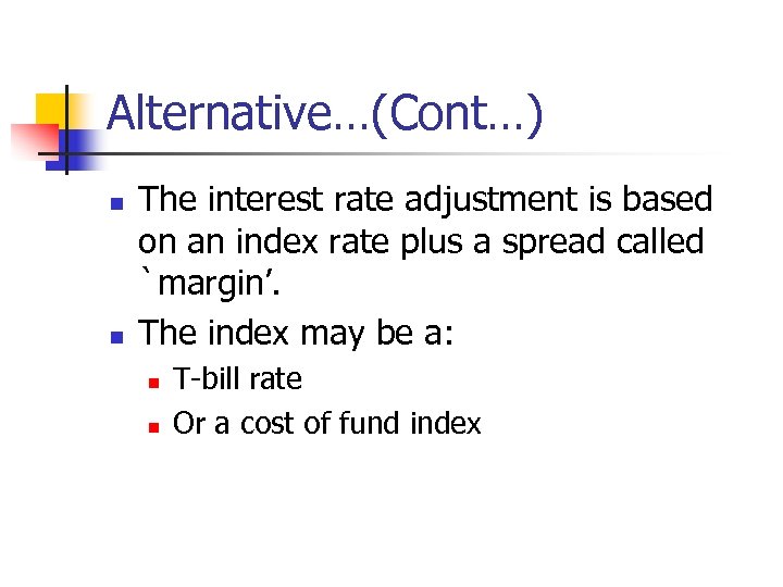 Alternative…(Cont…) n n The interest rate adjustment is based on an index rate plus a spread called `margin’. The index may be a: n n T-bill rate Or a cost of fund index
