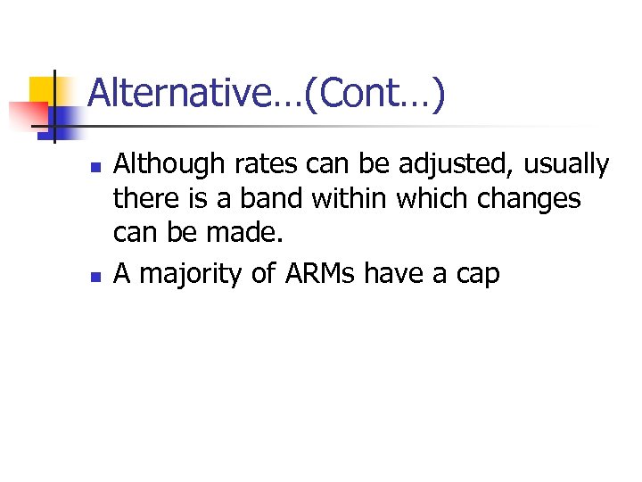 Alternative…(Cont…) n n Although rates can be adjusted, usually there is a band within which changes can be made. A majority of ARMs have a cap
