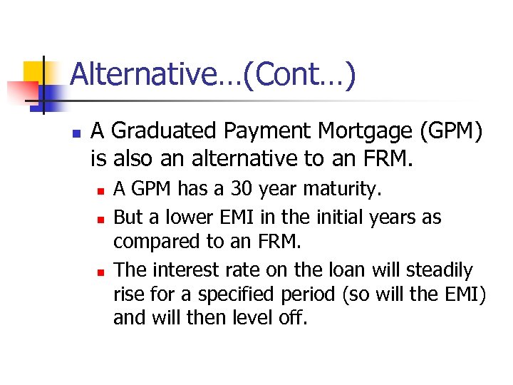 Alternative…(Cont…) n A Graduated Payment Mortgage (GPM) is also an alternative to an FRM. n n n A GPM has a 30 year maturity. But a lower EMI in the initial years as compared to an FRM. The interest rate on the loan will steadily rise for a specified period (so will the EMI) and will then level off.