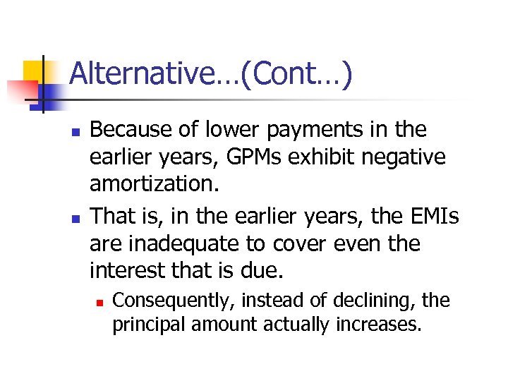 Alternative…(Cont…) n n Because of lower payments in the earlier years, GPMs exhibit negative amortization. That is, in the earlier years, the EMIs are inadequate to cover even the interest that is due. n Consequently, instead of declining, the principal amount actually increases.