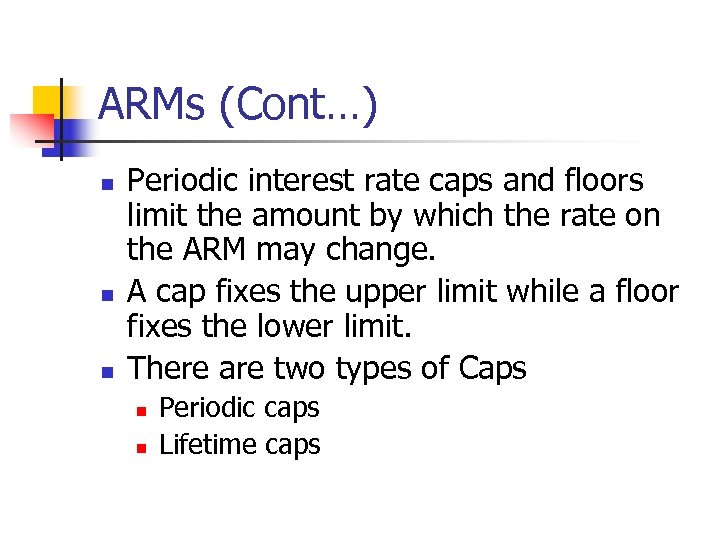 ARMs (Cont…) n n n Periodic interest rate caps and floors limit the amount by which the rate on the ARM may change. A cap fixes the upper limit while a floor fixes the lower limit. There are two types of Caps n n Periodic caps Lifetime caps