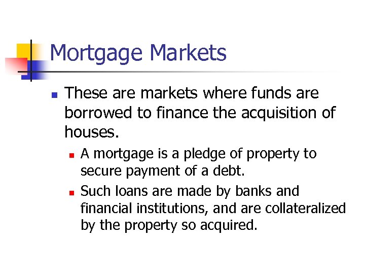 Mortgage Markets n These are markets where funds are borrowed to finance the acquisition of houses. n n A mortgage is a pledge of property to secure payment of a debt. Such loans are made by banks and financial institutions, and are collateralized by the property so acquired.