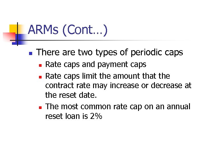 ARMs (Cont…) n There are two types of periodic caps n n n Rate caps and payment caps Rate caps limit the amount that the contract rate may increase or decrease at the reset date. The most common rate cap on an annual reset loan is 2%
