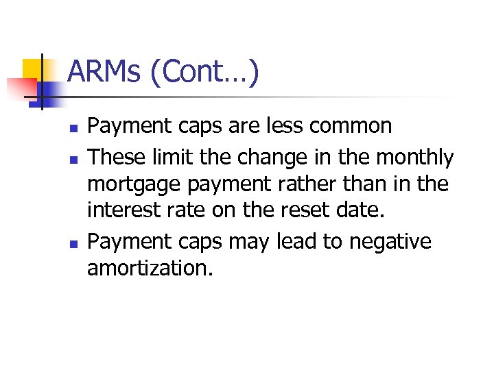 ARMs (Cont…) n n n Payment caps are less common These limit the change in the monthly mortgage payment rather than in the interest rate on the reset date. Payment caps may lead to negative amortization.